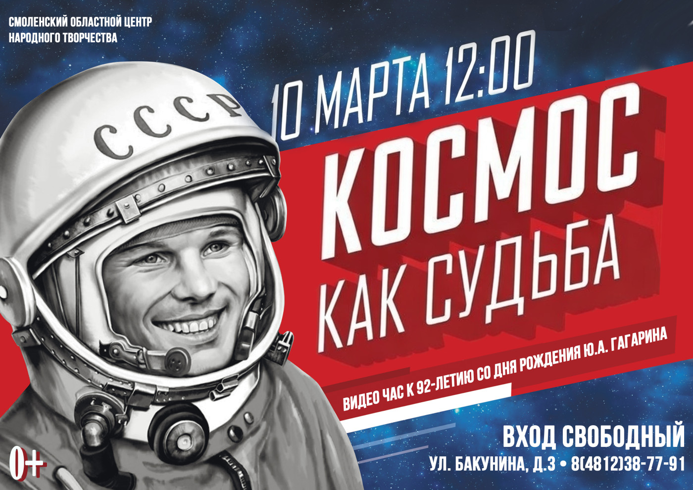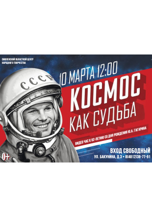 10 марта в 12:00 приглашаем на видеочас, посвященный 92-летию со дня рождения первого космонавта Земли, нашего земляка — Юрия Алексеевича Гагарина.