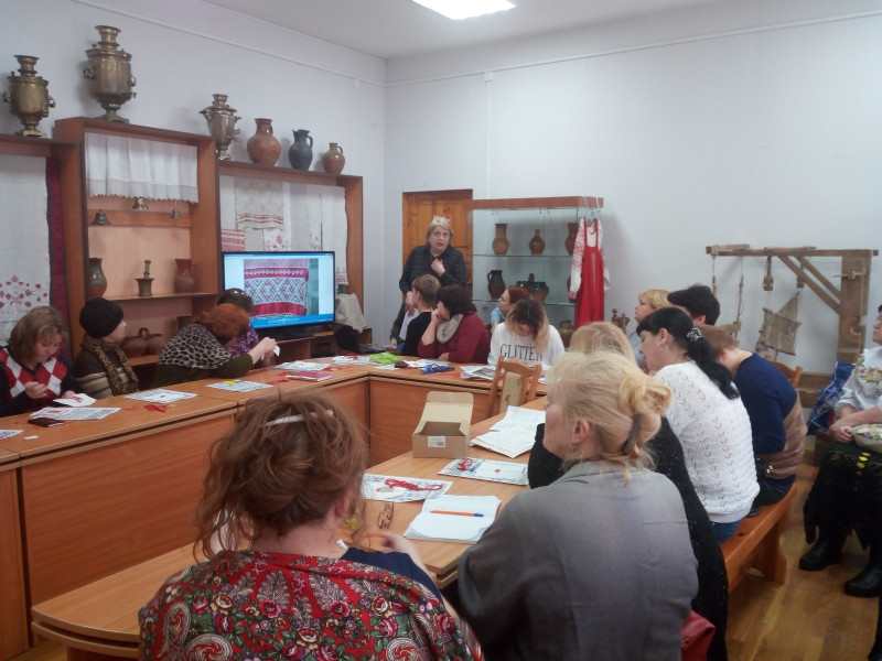 Во вторую часть встречи вошла лекция о традиционной смоленской вышивке с демонстрацией образцов из коллекции Смоленского государственного музея-заповедника и практическое занятие по вышивке традиционного местного орнамента «Поле».