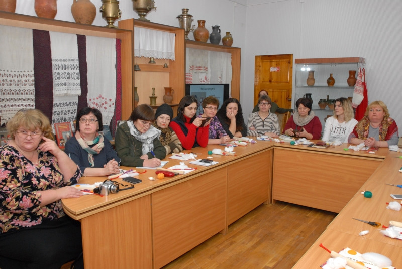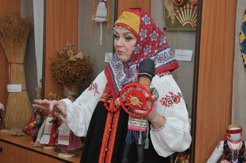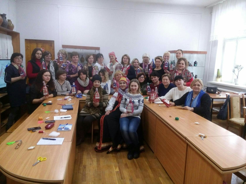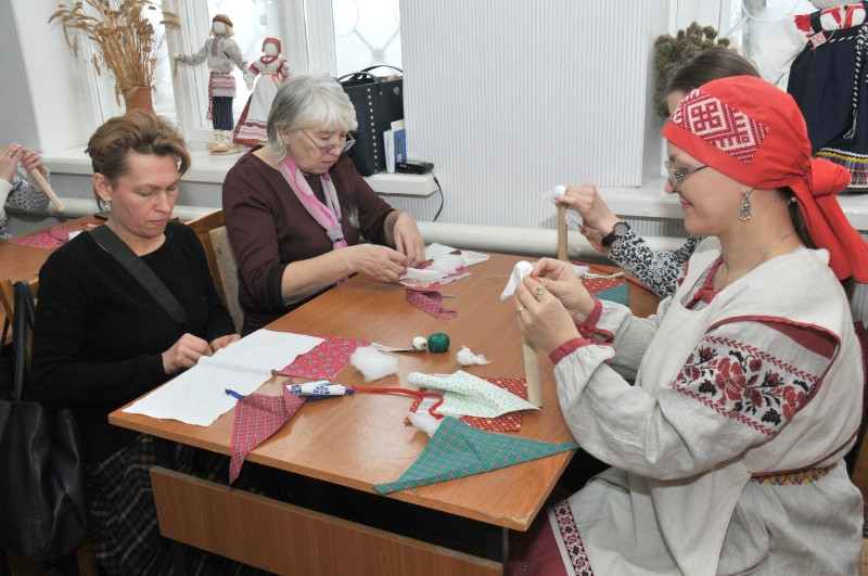 Первая часть мероприятия включала ознакомление участников с традиционными обрядовыми и календарными куклами и практическое занятие по изготовлению традиционной смоленской куклы «Столбец».