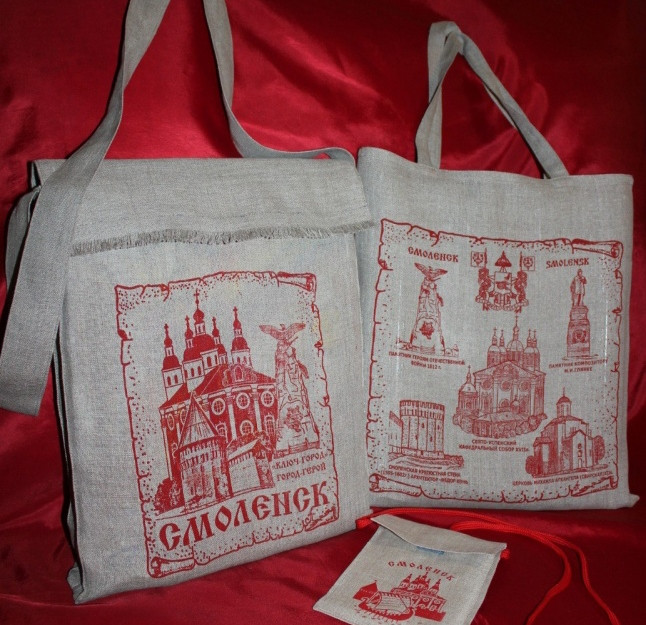 Орнаменты Смоленского края воспроизводятся в изделиях сувенирной продукции изо льна — салфетке, полотенце, народной рубахе, сумке, косынке.